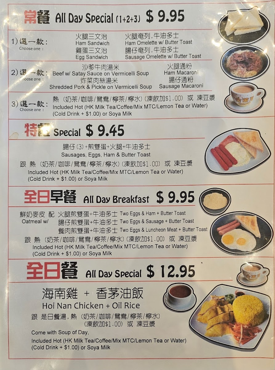 Very typical Hong Kong Style Cafe - Cha Chaan Teng. Located at the back of First Markham Place. First time to visit. Quick busy during lunch time on weekdays. They offer great selections of all day breakfast combo & lunch/dinner options. Cost effective and food served hot and fast. Service was good. Will definitely recommend to friends and family.